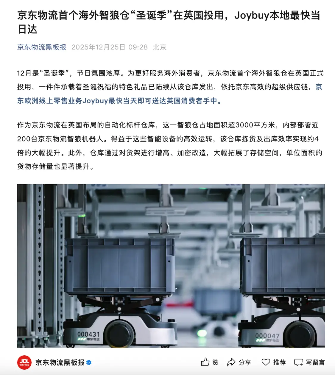 12月25日,据京东物流消息,京东物流首个海外智狼仓在英国正式投用。作为京东物流在英国布局的自动化标杆仓库,这一智狼仓占地面积超3000平方米,内部部署近200台京东物流智狼机器人,拣货及出库效率实现约4倍的提升。
