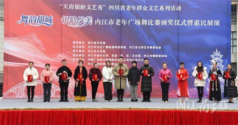 12月21日,东兴区大千园广场热闹非凡,“天府银龄文艺秀”四川省老年群众文艺系列活动——“舞韵甜城·银龄绽美”内江市老年广场舞比赛颁奖仪式暨惠民展演在此举行。来自内江各地的老年广场舞队伍齐聚一堂,用灵动的舞姿展现四川老年群体“老有所乐、老有所为”的精神风貌。